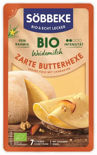Die Söbbeke BIO Zarte Butterhexe ist ein Weichkäse aus Kuhmilch mit zarter Konsistenz und einer essbaren Rotschmier-Rinde. Sie wird in Bio-Qualität hergestellt und passt gut zu Brot oder als Bestandteil einer Käseplatte.