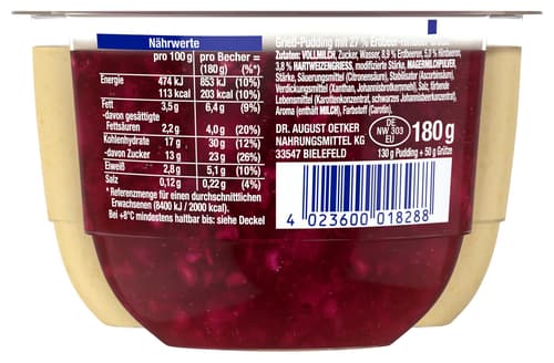 Der Dr. Oetker Grießpudding mit Erdbeer-Himbeer Grütze kombiniert einen klassischen, fein gekochten Grießpudding mit einer fruchtigen Beerenzubereitung. Die Kombination eignet sich als Dessert oder kleine Mahlzeit.