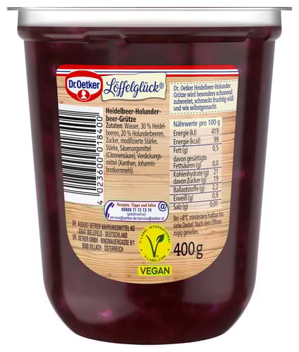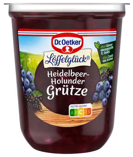 Die Dr. Oetker Löffelglück Heidelbeer-Holunder Grütze ist ein fruchtiges Dessert auf Basis von Heidelbeeren und Holunderbeeren. Sie eignet sich als süßer Abschluss einer Mahlzeit oder als Zwischenmahlzeit. Die Konsistenz ist leicht stückig und löffelbereit.