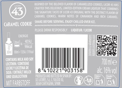 Licor 43 Caramel Cookie ist ein Sahnelikör mit Karamell-Keks-Geschmack und einem Alkoholgehalt von 16 %. Er basiert auf dem klassischen Licor 43 und kombiniert süße Dessertnoten mit cremiger Textur. Die 0,7-Liter-Flasche eignet sich für den puren Genuss, auf Eis oder als Zutat in Mixgetränken und Desserts.