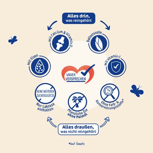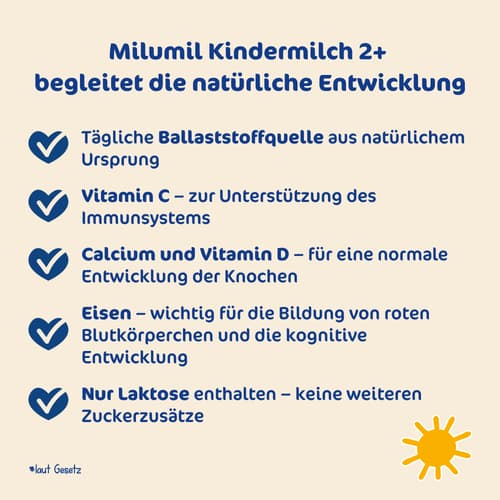 Begleitet die natürlichen Entwicklungsstufen deines Kleinkindes in der Wachstumsphase: Tägliche Ballaststoffquelle aus natürlichem Ursprung Vitamin C - zur Unterstützung des Immunsystems Calcium und Vitamin D - für eine normale Entwicklung der Knochen Eisen - wichtig für die Bildung von roten Blutkörperchen und die kognitive Entwicklung Nur Laktose enthalten - keine weiteren Zuckerzusätze * laut Gesetz