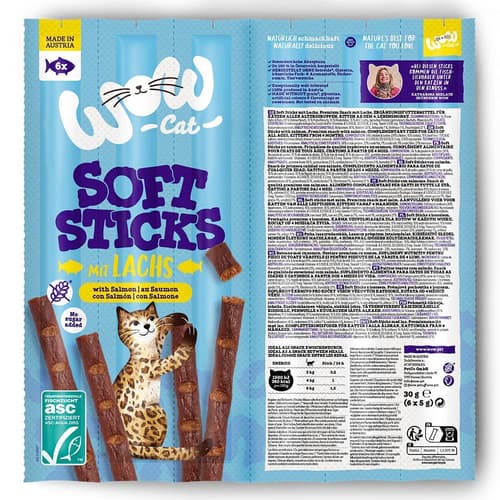 Für echte Feinschmecker: Die WOW CAT Soft Sticks mit Lachs sind eine unwiderstehliche Kombination aus frischem Geflügelfleisch, zarter Rinderleber und ASC-zertifiziertem Lachs – für besten Geschmack und eine Extraportion Omega-3-Fettsäuren.