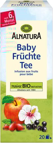 Ein Bio-Tee für jede Jahreszeit: Hagebutten und Äpfel sind seine Basis, Hibiskusblüten und Schwarze Johannisbeeren runden den Geschmack harmonisch ab. Der Alnatura Baby-Früchtetee ist damit ideal für Kinder nach dem 6. Lebensmonat sowie für die ganze Familie -sowohl warm als auch kalt getrunken. Alle Zutaten stammen aus Bio-Landwirtschaft. In jeder Packung befinden sich 20 Aufgussbeutel.