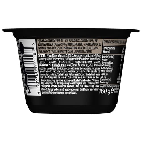 Zutaten: FRISCHKÄSE, Wasser, 0,5% Kokosnuss, modifizierte Stärke, Säureregulator Citronensäure, Süßungsmittel Sucralose, Acesulfam K; Laktase, Folsäure (Vitamin B9), Magnesiumcitrat, Aroma.