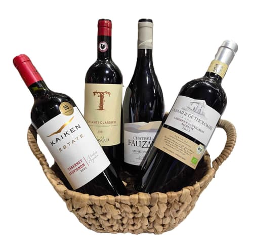 Der Geschenkkorb Rotwein enthält eine Auswahl internationaler Rotweine aus biologischem und klassischem Anbau. Er eignet sich als Präsent für Weinliebhaber und Genießer kräftiger Aromen.