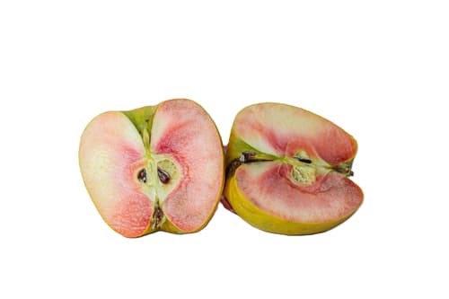 Ein Apfel, der außen goldgelb strahlt und innen in kräftigem Pink überrascht