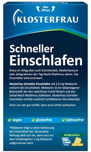 Klosterfrau Schneller Einschlafen Intens enthält 2,0 mg Melatonin pro Tablette und unterstützt den natürlichen Einschlafprozess. Das Produkt ist ideal für Personen, die eine sanfte Hilfe beim Einschlafen suchen.