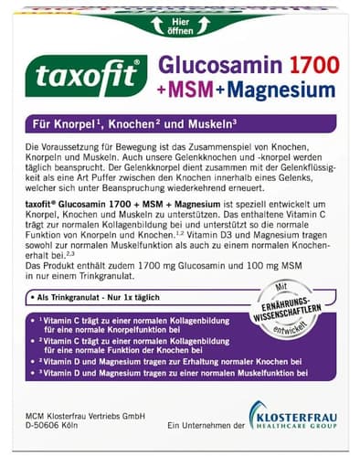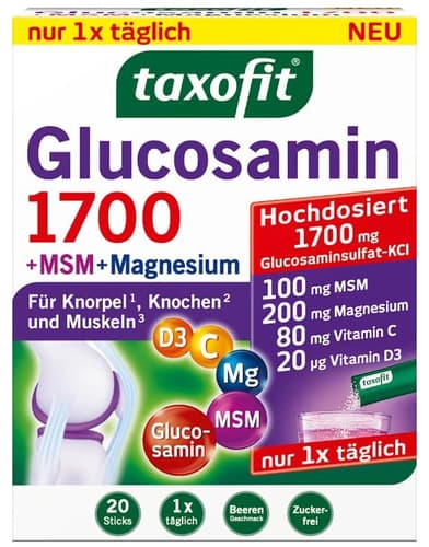 Taxofit Glucosamin 1700 + MSM + Magnesium unterstützt die normale Funktion von Gelenken und Muskeln. Die Kombination aus Glucosamin, MSM und Magnesium ist speziell auf die Bedürfnisse aktiver Menschen abgestimmt.