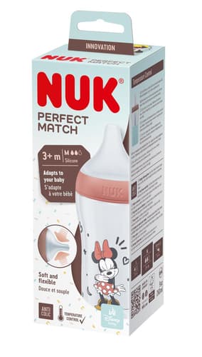 Die NUK Disney "Mickey/Minnie" Perfect Match Babyflasche mit 260 ml Fassungsvermögen ist ideal für Babys ab 3 Monaten. Der weiche, elastische Sauger mit Anti-Colic-Funktion sorgt für einen ruhigen Trinkfluss und ein hautähnliches Gefühl. Die patentierte Temperature Control-Anzeige bietet zusätzliche Sicherheit beim Füttern.