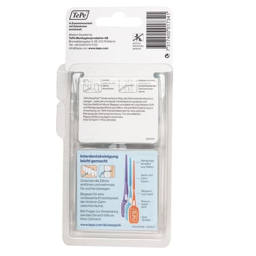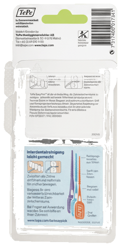 Entwickelt in Zusammenarbeit mit Zahnmedizinern, entfernt der EasyPick bis zu 40 % mehr Plaque als das Zähneputzen allein und hilft, Zahnfleischentzündungen und Karies vorzubeugen. TePe produziert alle Produkte mit 100 % grüner Energie aus erneuerbaren Ressourcen.