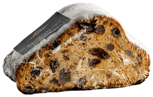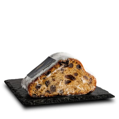 Handgemachter Butterstollen von Lindner Feinkost, geschnitten und verfeinert mit Sultaninen, Mandeln, Marzipan und einem Hauch Rum. Ideal für den anspruchsvollen Genuss.