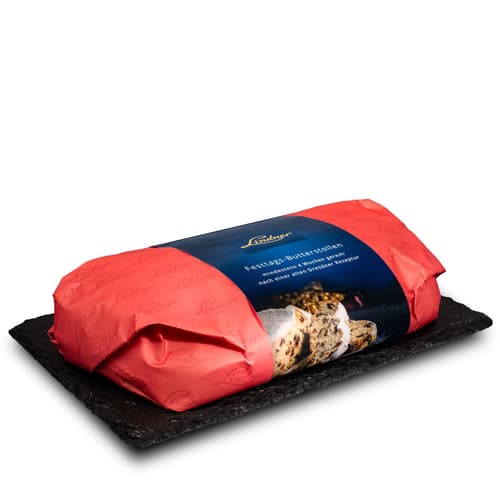 Festtagsstollen von Lindner Feinkost ist ein handgemachtes Gebäck, das mit Sultaninen, Mandeln, Marzipan und Rum verfeinert wurde. Perfekt gereift, bietet es eine saftige Konsistenz und ist ideal für die Weihnachtszeit.