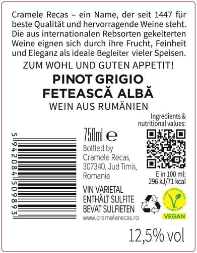 Der Recas Speis & Trank Pinot Grigio Feteasca Alba ist ein trockener Weißwein aus Rumänien mit einem Alkoholgehalt von 12 %. Er vereint die Frische des Pinot Grigio mit der Eleganz der Feteasca Alba-Traube und bietet ein harmonisches Geschmackserlebnis.
