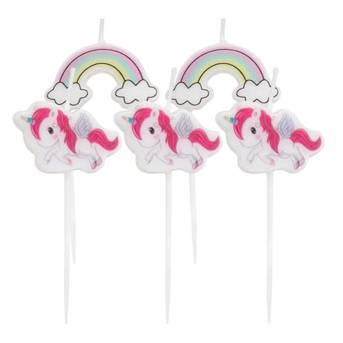 Die Kerzen sind in einem farbenfrohen Einhorn- und Regenbogendesign gestaltet und bringen Freude auf jede Feier.