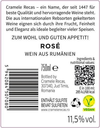 Speis&Trank Rosé ist ein fruchtiger Roséwein der Marke Cramele Recas. Mit einem Alkoholgehalt von 12 % bietet er ein ausgewogenes Geschmackserlebnis, das sich ideal für entspannte Abende oder gesellige Runden eignet.