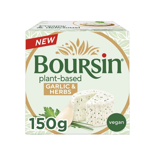 Der vegane Frischkäse von Boursin kombiniert eine streichfähige Konsistenz mit dem typischen Geschmack von Knoblauch und Kräutern. Er eignet sich als Brotaufstrich oder zum Verfeinern von Speisen.