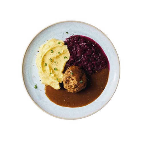 Kartoffel 25.8%, Schwein Frikadelle Hausfrau Bergland 125g (Schweinefleisch 81%(z. Teil fein zerkleinert), Zwiebeln, Paniermehl(Weizenmehl, Hefe),Speisesalz, Gewürze,Gartenkräuter, Rapsöl), Wasser, Rotkohl 14.4%, VOLLMILCH, Preiselbeeren 3.4% (Kulturpreiselbeeren, Preiselbeeren, Zucker, Wasser, Geliermittel Pektine, Johannisbrotkernmehl und Xanthan, Säuerungsmittel Citronensäure.), BUTTER, Branntweinessig, Zwiebel, Rotwein ((VOL.12,5%)enthält SULFITE), Zucker, SENF (Wasser, SENFSAAT, Branntweinessig, Salz, Zucker, Gewürze, natürliches Aroma.), DIJONSENF GROB (Wasser, SENFSAAT, Branntweinessig, Salz, Weißweinessig, Zucker, Gewürze, Säuerungsmittel (Citronensäure).), MEHLSCHWITZE (WEIZENMEHL, Palmfett, Karamell, Maltodextrin), SCHLAGSAHNE, jodiertes Speisesalz (Salz, Kaliumjodat), Rapsöl, Maisstärke, Rinderbrühe (Salz, Maltodextrin, Stärke, Rinderfett, Rindfleischextrakt, natürliches Aroma, Karamellzucker, Curcuma, Säuerungsmittel (Weinsäure),Sonnenblumenöl.), Vegane Saucenzubereitung (Maltodextrin, Stärke, Meersalz, Zucker, natriumreduziertes Salz*, Gemüse (Zwiebeln, Tomaten, Karotten), natürliche Aromen, Karamellzuckersirup, Sonnenblumenöl, Verdickungsmittel Johannisbrotkernmehl, Gewürze, Knoblauch, Rosmarin. *25 % natürlicher Kaliumchloridanteil), Geflügelfond (Hühnerfleischkochsaft konzentriert (Wasser, Hühnerfleischextrakt , Hühnerfleischextraktpulver , Salz), Salz, Aromen, Zucker, Hefeextrakt, modifizierte Stärke, Zwiebelpulver, natürliche Aromen, Alkoholessig, weisser Pfeffer, Stabilisator (Xanthan)), Dunkler Traubenessig (Weinessig (enthält SULFITE), gekochter Traubenmost(enthält SULFITE).), Muskatnuss, Thymian, SOJASAUCE (Wasser, SOJABOHNEN, WEIZEN, Salz), Rosmarin, Möhre, SELLERIE, Zwiebel, Gewürze.