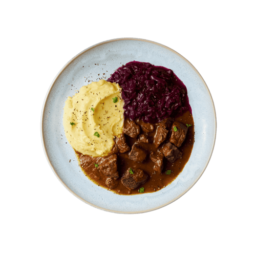 Genießen Sie unser Rotweingulasch mit Preiselbeerrotkohl und Kartoffelstampf – ganz ohne stundenlanges Schmoren! Wir haben das Gericht so zubereitet, dass es nur noch kurz erhitzt werden muss: In wenigen Minuten können Sie einen herzhaften Klassiker genießen, der schmeckt wie aus der guten Landhausküche. Das Rotweingulasch ist kräftig und vollmundig, mit zart geschmortem Fleisch und einer aromatischen Sauce, die durch Rotwein ihre tiefe, runde Note bekommt. Dazu servieren wir fein abgeschmeckten Preiselbeerrotkohl, der mit seiner fruchtigen Süße perfekt mit dem Gulasch harmoniert, und cremigen Kartoffelstampf, der das Gericht herrlich weich und rund abrundet. Das Ergebnis: ein wohliges, ausgewogenes Lieblingsgericht mit echter Sonntagsessen-Atmosphäre – nur viel schneller fertig.
