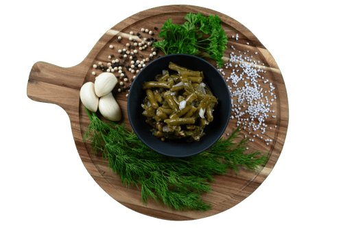 Brechbohnen, Zwiebeln, Essig, Sonnenblumenöl, Zucker, Kräuter, Gewürze
