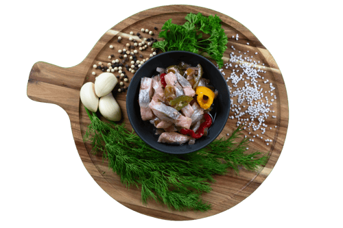 Matjesfilet, Zwiebeln, Gewürzgurke, Paprika, Sonnenblumenöl, Essig, Zucker, Gewürze