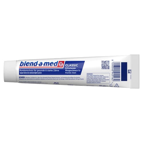 Blend-A-Med Zahnpasta Classic bietet umfassenden Schutz für gesunde und starke Zähne. Bei zweimal täglichem Zähneputzen schützt sie 24 Stunden vor Karies, stärkt den Zahnschmelz und entfernt Oberflächenverfärbungen.