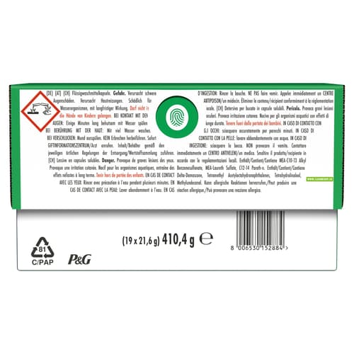 Legen Sie den Pod immer zuerst hinten in die leere Trommel und geben Sie anschließend die Wäsche hinzu. Für beste Ergebnisse beachten Sie die Dosierungsanleitung auf der Verpackung.