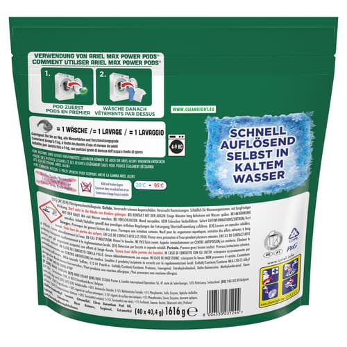 Ariel MaxPower Pods Universal 40WL sind leistungsstarke Flüssigwaschmittelkapseln mit drei integrierten Zusatzstoffen: Fleckenentferner, Geruchsentferner und Hygiene-Reinigungsbooster. Sie entfernen hartnäckige Flecken wie Fett und Gras sowie starke Gerüche bereits beim ersten Waschgang.