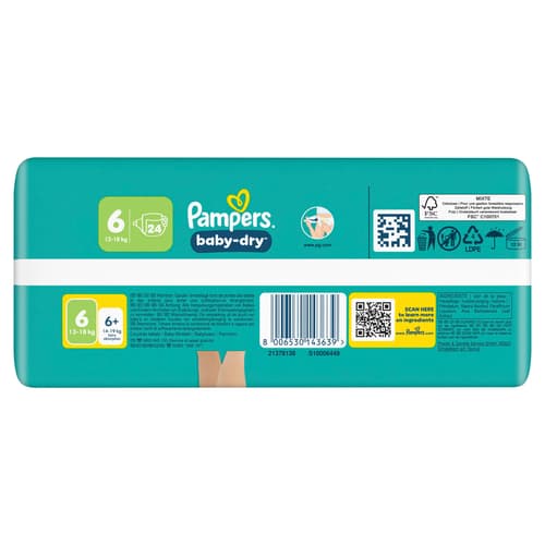 Pampers Baby-Dry Windeln Gr. 6 Extra Large bieten zuverlässigen Schutz für Babys mit einem Gewicht von 13-18 kg. Der schnell absorbierende Kern sorgt für Trockenheit und Komfort die ganze Nacht.