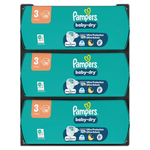 Pampers Baby-Dry Windeln Gr. 3 Midi sind für Babys mit einem Gewicht von 6-10 kg geeignet. Sie bieten zuverlässigen Schutz und Komfort für die ganze Nacht.