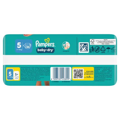 26 StkPampers Baby-Dry Windeln Gr. 5 Junior sind für Babys mit einem Gewicht von 11-16 kg geeignet. Sie bieten bis zu 100% Auslaufschutz und Komfort für die ganze Nacht.