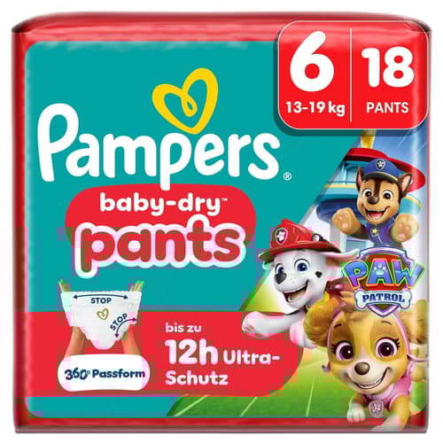 Deutschland,Gestalte das Windelwechseln einfacher und lustiger mit der Pampers Baby-Dry Pants Paw Patrol Edition! Mit den Designs deiner Paw Patrol Lieblingsfiguren kombinieren diese Pants unsere bewährte Trockenheit mit spielerischem Stil. Das 360° weiche und dehnbare Bauchbündchen passt sich den Bewegungen deines aktiven Babys an und bietet dank der sicheren Passform bis zu 12 Stunden Auslaufschutz. Anti-Auslaufbündchen und Stop & Schutz Täschchen helfen, Auslaufen an den Seiten und am Rücken zu verhindern. Der super saugfähige Kern schließt Flüssigkeit sofort ein für eine Trockenheit, auf die du dich Tag und Nacht verlassen kannst. Wie all unsere Pants lassen sich auch Baby-Dry Paw Patrol Pants leicht wechseln, selbst wenn dein Baby sich bewegt: zum Anziehen Pants einfach hochziehen, zum Ausziehen die Seitenbündchen aufreißen, einrollen und dank Klebestreifen einfach entsorgen. Genau wie für dich steht die Sicherheit deines Babys auch für Pampers an erster Stelle: Pampers Baby-Dry Paw Patrol Pants sind dermatologisch getestet, enthalten 0% EU-Parfümallergene (keine absichtlich hinzugefügten EU-Parfümallergene gemäß der EU-Kosmetikverordnung (EG) Nr. 1223/2009) und sind OEKO-TEX STANDARD 100 getestet und zertifiziert. Möchtest du mehr über die Bestandteile unserer Produkte erfahren? Besuche uns auf pampers.de, pampers.at und pampers.ch.