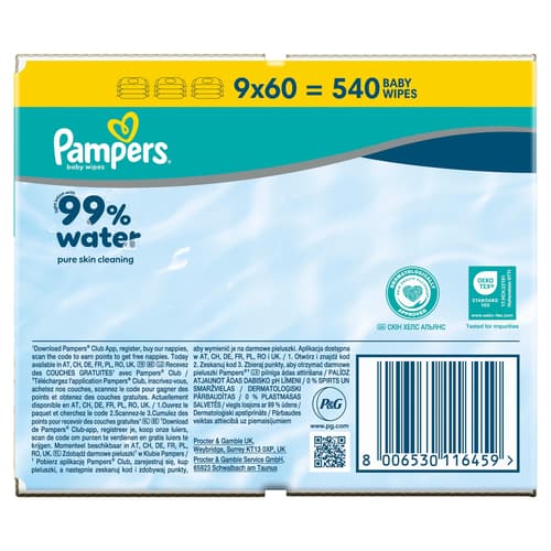 Die Feuchttücher enthalten weder Alkohol noch Parfüm und sind dermatologisch getestet. Pampers steht seit über 60 Jahren für hochwertige Babyprodukte, die speziell für empfindliche Haut entwickelt wurden.