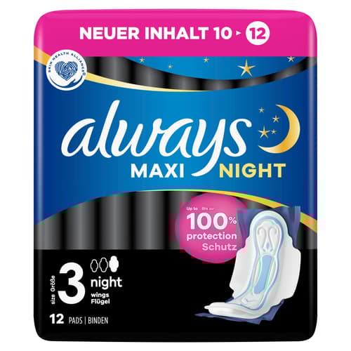 Always Maxi Profresh Night Damenbinden (Größe 4) mit Flügeln bieten zuverlässigen Schutz während der Nacht. Sie sind speziell für starke Perioden entwickelt und verfügen über Auslaufbarrieren sowie einen saugfähigen Kern für ein sicheres Gefühl.