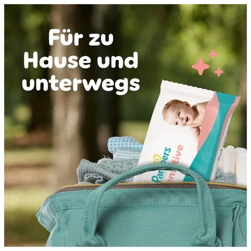 Deutschland,Pampers Sensitive Feuchttücher - 2-in-1 sanfte Reinigung & Hautschutz. Dank unserer speziellen Formel wird der natürliche pH-Wert der Haut wiederherstellt und die Haut vor Rötungen geschützt. Pampers Sensitive Feuchttücher enthalten 0% Alkohol und Parfüm. Die Formel ist dermatologisch getestet und von Dermatologen der Skin Health Alliance bestätigt.