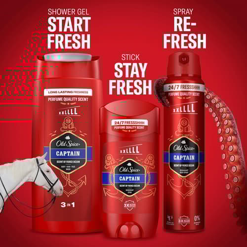 Old Spice Captain Deospray bietet langanhaltenden Schutz vor Gerüchen und sorgt für ein frisches Gefühl den ganzen Tag über. Die 3x Active Defence-Formel kombiniert Duft, Geruchsschutz und Geruchsbekämpfer.