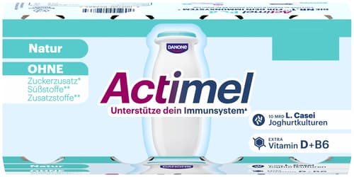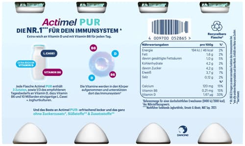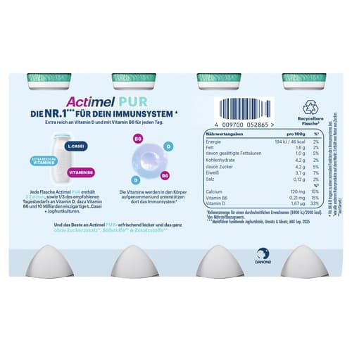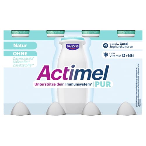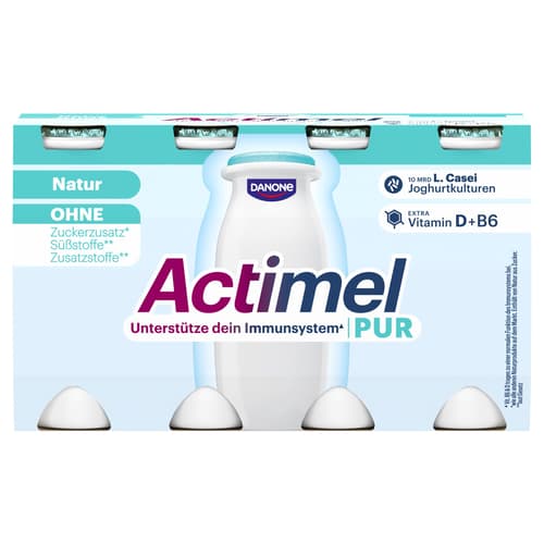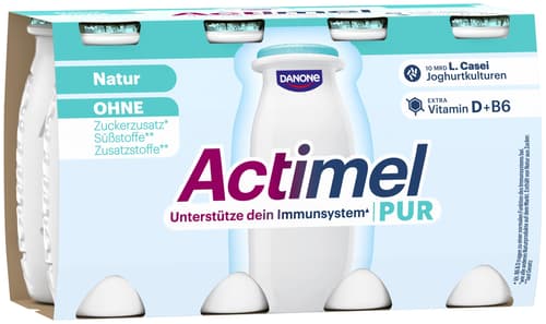 Actimel Plus Pur ist ein probiotisches Joghurtgetränk mit der einzigartigen L. casei Danone-Kultur. Es enthält Vitamin D und B6, die zur normalen Funktion des Immunsystems beitragen.