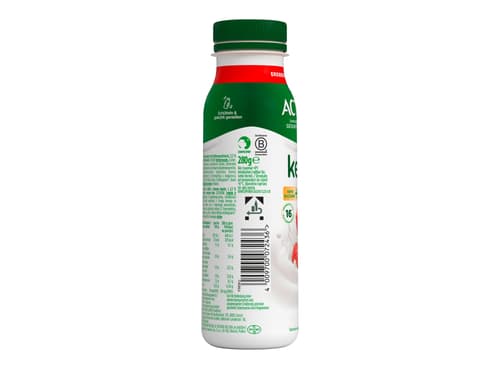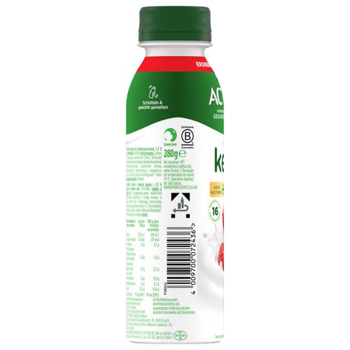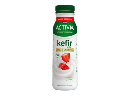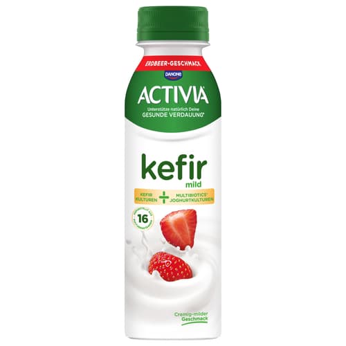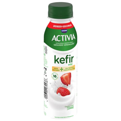 Zutaten: KEFIRERZEUGNIS, Zucker, 1% Erdbeerpüree, modifizierte Stärke, färbendes Karottenkonzentrat und schwarzes Karottenkonzentrat, Zitronensaftkonzentrat, natürliches Aroma, Joghurtkulturen (S. thermophilus, L. bulgaricus, L.lactis). Mit Bifidus Kultur ActiRegularis®. Kann glutenhaltige Getreide enthalten.