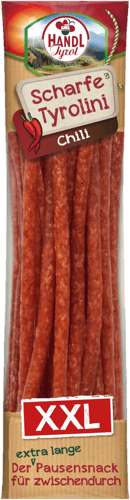 Scharfe Tyrolini von Handl Tyrol sind eine leicht geräucherte und luftgetrocknete Rohwurst nach Art der Kaminwurzen. Mit feurigem Chili entfalten sie bei jedem Bissen eine angenehme Schärfe.
