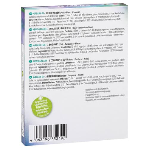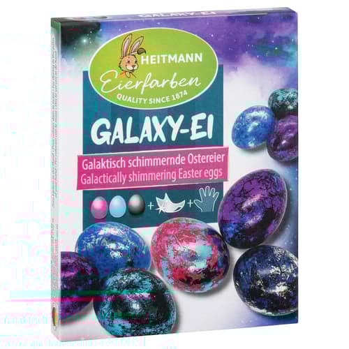 Die HEITMANN Eierfarbe Galaxy-Ei erzeugt einen mehrfarbigen Effekt mit galaktischer Optik. Durch spezielle Farbkombinationen entstehen einzigartige Muster.