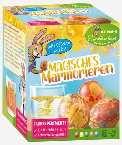 Die HEITMANN Eierfarbe Magisches Marmorieren erzeugt individuelle Marmormuster auf Ostereiern. Jede Anwendung führt zu einzigartigen Ergebnissen.