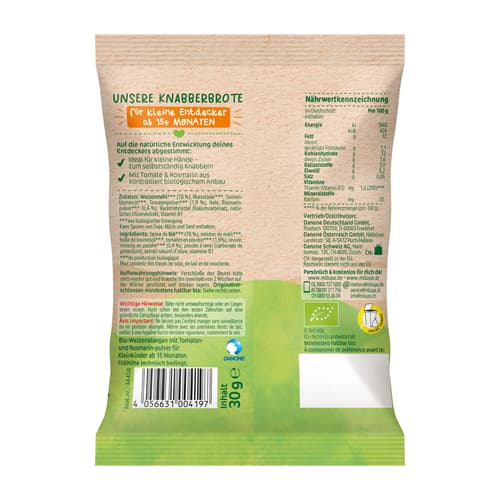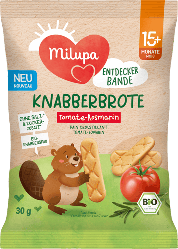 Knabbern, entdecken, genießen: Die Milupa Entdeckerbande Knabberbrote Tomate-Rosmarin begleiten kleine Entdecker ab 15+ Monaten bei ihren ersten Snack-Abenteuern. Mit Tomaten und Rosmarin in Bio-Qualität und ganz ohne Salz*- und Zuckerzusatz** sind die Knabebrbrote ideal für kleine Hände und große Entdeckerlust. So wird das selbstständige Entdecken neuer Texturen, Formen und Geschmäcker unterstützt.