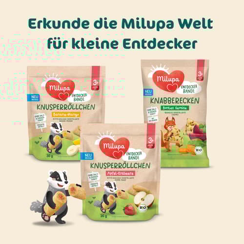 30 gVielfältiger leckerer Knusper- und Knabberspaß mit der Milupa Entdeckerbande.