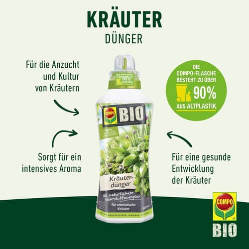 COMPO BIO Kräuterdünger ist ein Flüssigdünger, der speziell für Gewürzpflanzen und Heilkräuter wie Rosmarin, Petersilie, Thymian oder Basilikum entwickelt wurde. Die ausgewogene Nährstoffformel fördert kräftiges Wachstum und ein intensives Aroma.