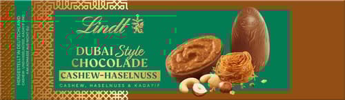 Zutaten: CASHEWKERN-HASELNUSS-Engelshaar-Füllung [CASHEWKERNE* (27%), Zucker, HASELNÜSSE* (18%), Engelshaar Teigfäden* (15%) (WEIZENmehl, Wasser, Maisstärke, Sonnenblumenöl, Salz), Kakaobutter, VollMILCHpulver, BUTTERreinfett, MagerMILCHpulver, Salz, Emulgator (SOJAlecithin), Aromen, Invertzuckersirup, PISTAZIEN, MANDELN], Zucker, Kakaobutter, VollMILCHpulver, Kakaomasse*, Emulgator (SOJAlecithin), GERSTENmalzextrakt, Aroma. Kann andere SCHALENFRÜCHTE, ERDNÜSSE, SESAMSAMEN, andere GLUTENHALTIGE GETREIDE enthalten.