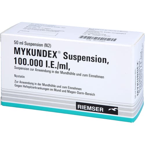 Wirkstoff: Nystatin. Anwendungsgebiete: Infektionen durch Nystatin-empfindliche Hefepilze (z. B. Candida albicans) im Mund (Mundsoor) und Magen-Darm-Bereich. Warnhinweis: Mykundex Suspension enthält Ethanol (Alkohol) und Sucrose.