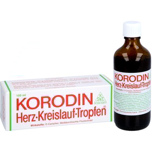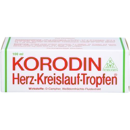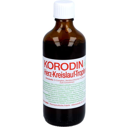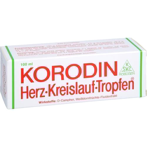 Wenn Sie sich nach 6 Wochen nicht besser oder gar schlechter fühlen, wenden Sie sich an Ihren Arzt. Korodin Herz-Kreislauf-Tropfen enthalten als Wirkstoff eine Kombination aus D-Campher und Weißdornfrüchte-Extrakt. Korodin Herz-Kreislauf-Tropfen werden angewendet bei Schwindelanfälligkeit infolge niedrigen Blutdrucks, insbesondere beim Aufstehen nach dem Liegen, Bücken oder längerem Sitzen (hypotone und orthostatische Kreislaufregulationsstörungen).