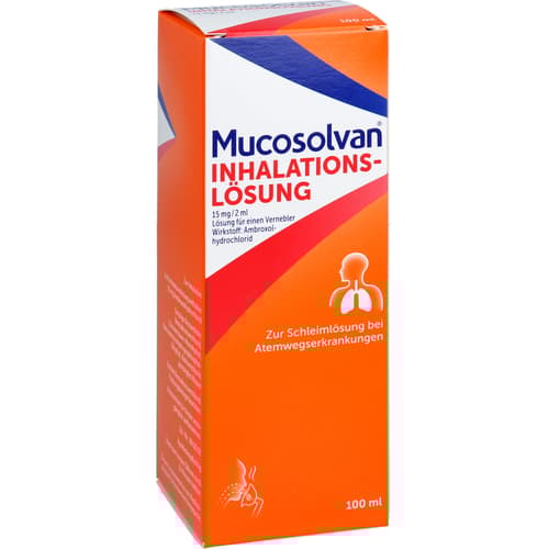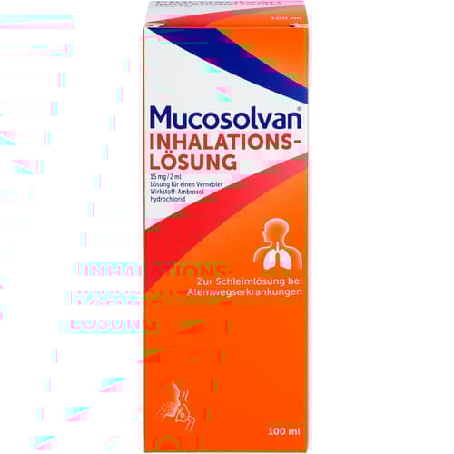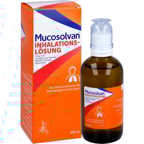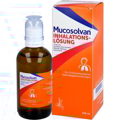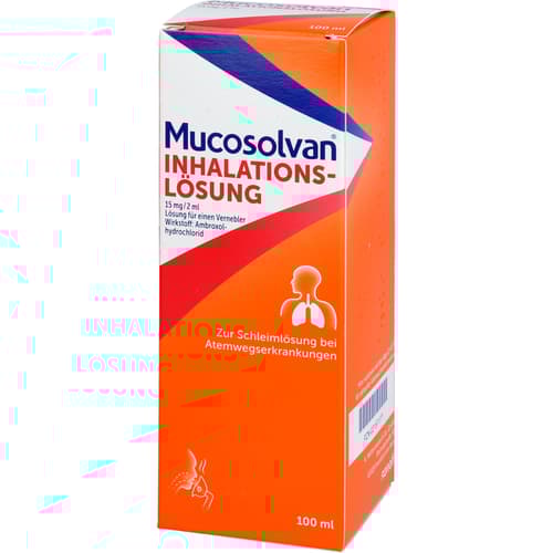 Mucosolvan Inhalationslösung 15 mg/2 ml Lösung für einen Vernebler. Wirkstoff: Ambroxolhydrochlorid. Anwendungsgebiete: zur Schleim lösenden Behandlung bei akuten und chronischen Erkrankungen der Bronchien und der Lunge mit zähem Schleim.Warnhinweis: Enthält Benzalkoniumchlorid!Zu Risiken und Nebenwirkungen lesen Sie die Packungsbeilage und fragen Sie Ihre Ärztin, Ihren Arzt oder in Ihrer Apotheke.