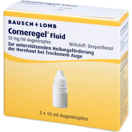 Corneregel Fluid 50 mg/ml Augentropfen. Wirkstoff: Dexpanthenol. Anwendungsgebiete: Zur unterstützenden Behandlung der Heilung von Haut- und Schleimhautläsionen des Auges bei sogenanntem "Trockenem Auge" (Konjunktivitis sicca bzw. Keratokonjunktivitis sicca). Warnhinweis: Enthält Phosphate.Zu Risiken und Nebenwirkungen lesen Sie die Packungsbeilage und fragen Sie Ihre Ärztin, Ihren Arzt oder in Ihrer Apotheke.