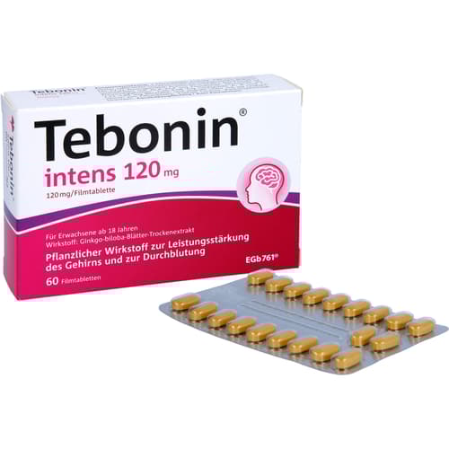 Tebonin intens 120 mg Filmtablette. Wirkstoff: Ginkgo-biloba-Blätter-Trockenextrakt. Anwendungsgebiete: zur symptomatischen Behandlung von hirnorganisch bedingten geistigen Leistungseinbußen. Die Anwendung erfolgt im Rahmen eines therapeutischen Gesamtkonzeptes bei fortschreitender Abnahme bzw. Verlust erworbener geistiger Fähigkeiten (dementielles Syndrom) mit den Hauptbeschwerden: Gedächtnisstörungen, Konzentrationsstörungen, Niedergeschlagenheit, Schwindel, Ohrensausen, Kopfschmerzen; zur Verlängerung der schmerzfreien Gehstrecke bei arterieller Verschlusskrankheit in den Gliedmaßen, sog. "Schaufensterkrankheit" (Claudicatio intermittens im Stadium II nach FONTAINE) im Rahmen physikalisch-therapeutischer Maßnahmen, insbesondere Gehtraining; bei Schwindel infolge von Durchblutungsstörungen oder altersbedingten Rückbildungsvorgängen (Vertigo vaskulärer und involutiver Genese); zur unterstützenden Behandlung von Ohrgeräuschen infolge von Durchblutungsstörungen oder altersbedingten Rückbildungsvorgängen (Tinnitus vaskulärer und involutiver Genese).Zu Risiken und Nebenwirkungen lesen Sie die Packungsbeilage und fragen Sie Ihre Ärztin, Ihren Arzt oder in Ihrer Apotheke.