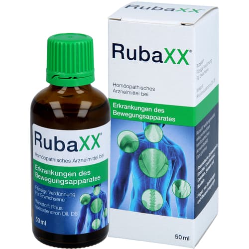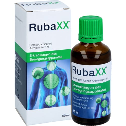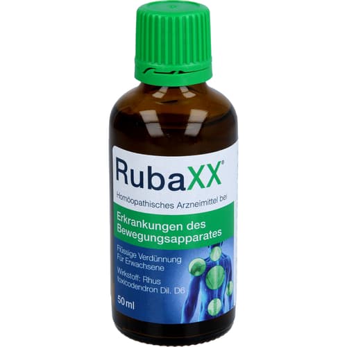 RubaXX, Flüssige Verdünnung. Wirkstoff: Rhus toxicodendron Dil. D6. Anwendungsgebiete: Homöopathisches Arzneimittel bei rheumatischen Schmerzen in Knochen, Knochenhaut, Gelenken, Sehnen und Muskeln und Folgen von Verletzungen und Überanstrengungen. Warnhinweis: Enthält 51 Vol.-% Alkohol!Zu Risiken und Nebenwirkungen lesen Sie die Packungsbeilage und fragen Sie Ihre Ärztin, Ihren Arzt oder in Ihrer Apotheke.